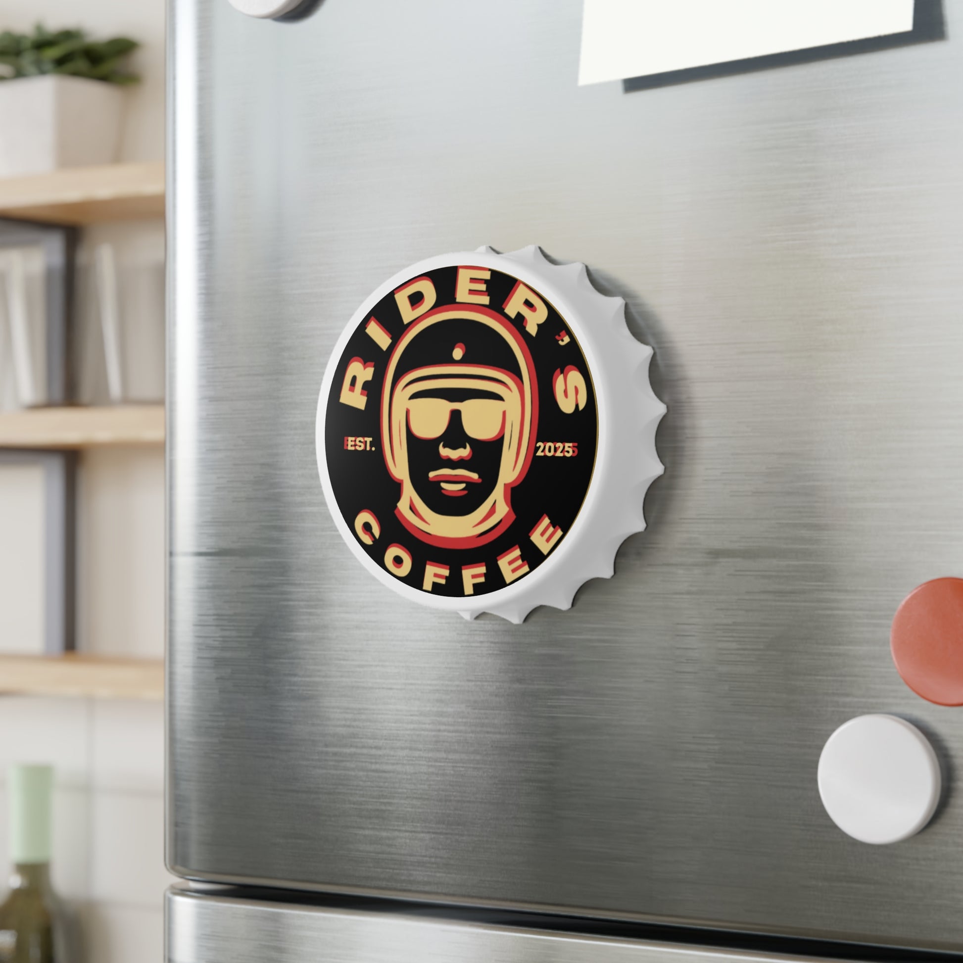 This bottle opener feels like a roadside café on a Sunday morning: solid in the hand, ready to flip off a cap and keep the good times rolling. The top side shows a bold, moto-inspired emblem — a helmeted rider in retro shades — rendered in bright, matte colors that stand out on a fridge or bar. Turn it over and you’ve got two practical opening mechanisms built into a sturdy metal body, plus two strong magnets to hold it where you need it. It’s compact, tactile, and made to be used and seen during casual hangouts, post-ride coffee stops, or backyard evenings.